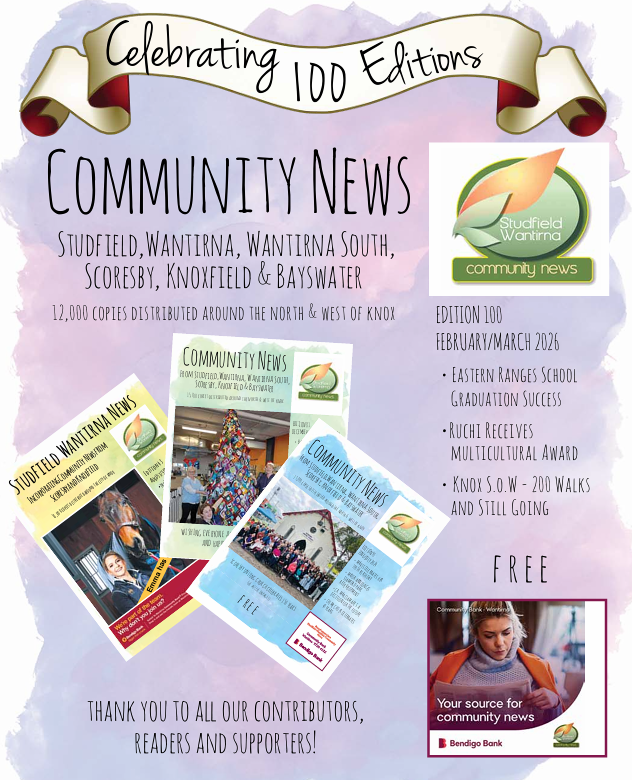 The purpose of the newspaper is to strengthen our community by providing a forum for local news and information. It gives local people an opportunity to connect with their community and to find out more about the groups, activities and services that are available. We aim to highlight local achievements, promote local businesses, support local initiatives, provide an opportunity for local people to feel connected with Wantirna’s history and build a sense of identity within our community.